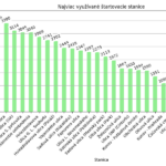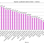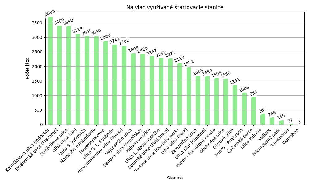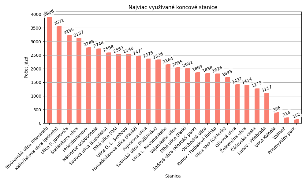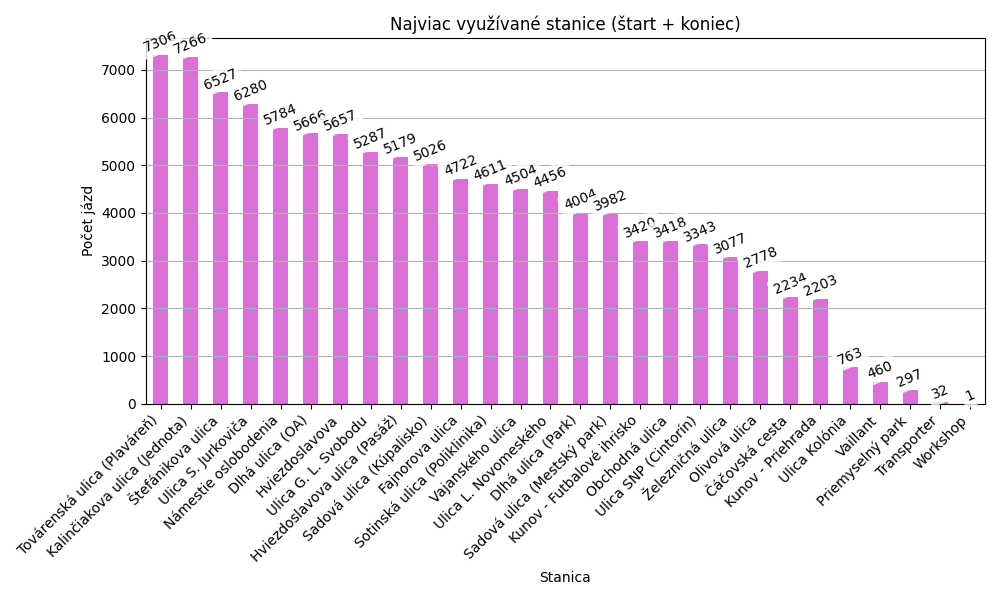 Analýza dát odhalila najobľúbenejšie „uzly“ mestskej siete. Najrušnejšími stanicami, kde sa sústredil najväčší pohyb bicyklov, boli: Továrenská ulica (plaváreň): 7 306 jázd (štart + cieľ); Kalinčiakova ulica (Jednota): 7 266 jázd; Štefánikova ulica: 6 527 jázd.